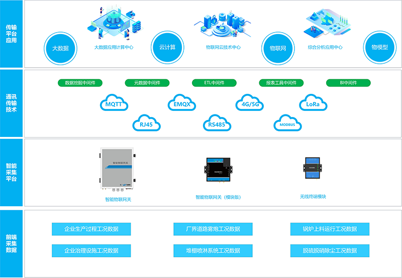 该企业在日常生产活动中,缺少对全厂生产治理工艺的运行工况监测,尤其缺少对运输皮带、除尘雾炮、点试除尘等小型生产治理设备的运行工况监测,不能实时监管生产+治理设备的联动运行情况,会造成企业资源的浪费以及治理不及时造成排污超标的隐患,为解决企业该问题,同时响应河北省非现场监管执法相关标准政策,我司根据企业实际情况制定工况数 据采集方案。